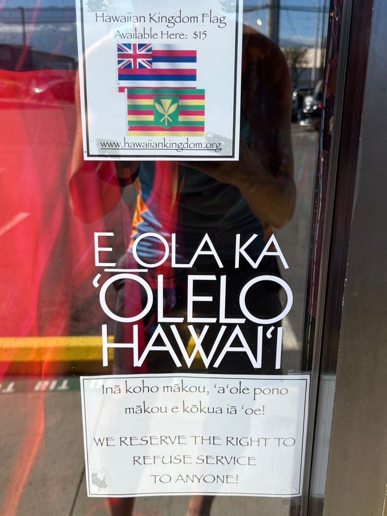 Some signage in ʻŌH at Rachel Ray’s Uʻi Gallery in Kahului. E ola ka ʻōlelo Hawaiʻi is the motto of the revitalization movement, meaning ʻThe Hawaiian language shall live!ʻ (Photo taken by the author; please ignore my reflection in the background.