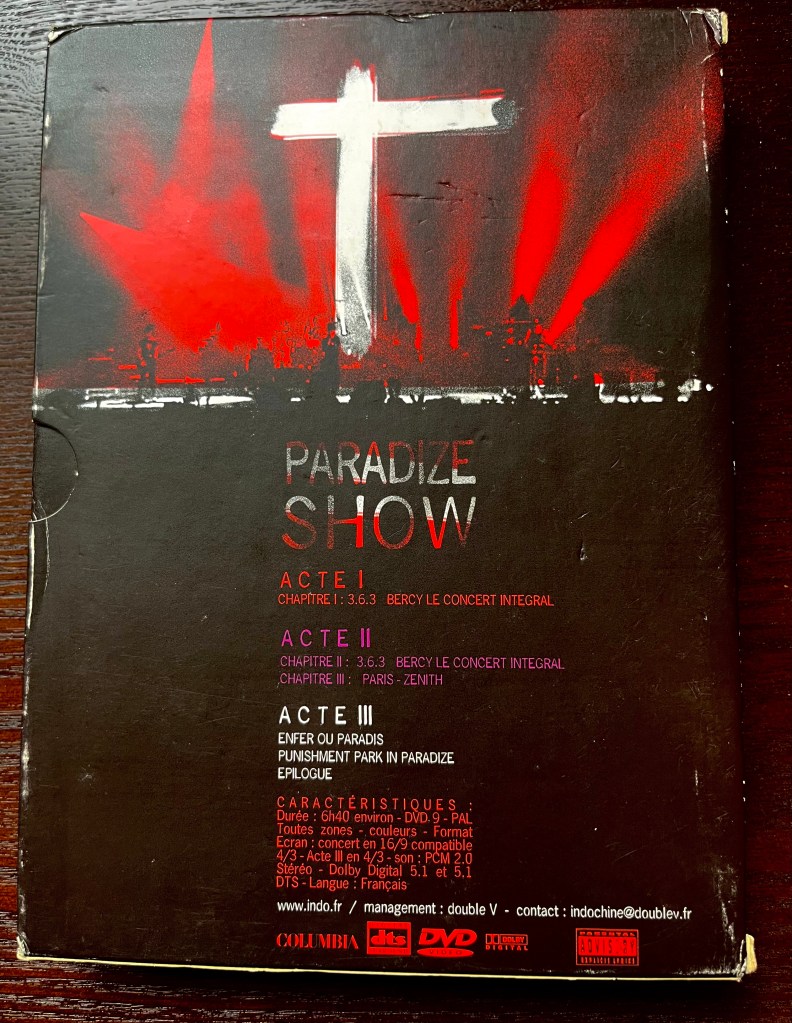 The front side of my well-worn copy of Indochine’s concert film from 2003. It’s PAL format so I had to buy a non-regional DVD player to watch. Yes, I’m that kind of fan ;). (Photo by MM)
