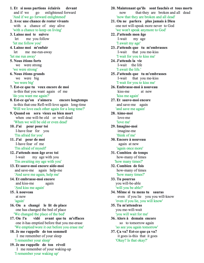 Furthermore, in line 29, Google translated imaginer with the cognate English imagine while I chose think. I’m not sure which is better here, but think does sound a little more natural. If we compare lines 31 and 32, Google again did a better job in reflecting the French. While I translated both lines the same as ‘how many times’, suggesting repetition of the same word, the French uses two different words for time, temps and fois. Google’s translation reflects this with how long and how many times. And one more difference but not necessarily an improvement on Google’s part is line 37. Notice that in line 36, the speaker is saying goodbye to their interlocutor. In line 37, the French is: Ça va? Est-ce que ça va? Google has this as: How are you? Are you okay? I think that is kind of weird given the parting that was just stated in the previous line. Thus, I rendered it: Okay? Is that okay? The intention here is that the speaker is asking permission to see their lover again the next day, which I think makes more sense, at least on my interpretation of the lyrical content.