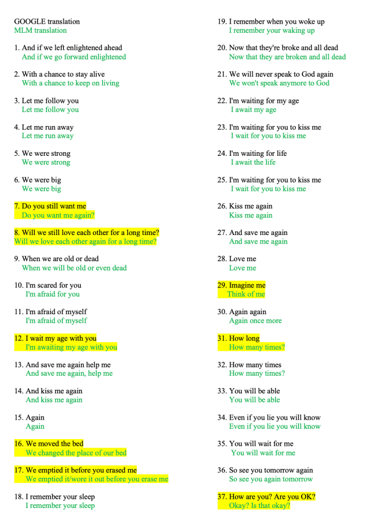 The good news is that both are similar, so I’m at least as good as Google, and vice versa, but I will make a couple of self-criticisms here. First, in lines 7 and 8, I translated encore as again where still actually makes more sense. So, Google got me there. However, in line 12, we came up with more or less the same rendering (4), which I think still sounds odd.