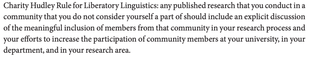 As mentioned, positionality is a concept that’s new to me. I suspect that linguists trained in a more anthropological approach are typically exposed to it in grad school, but for formal syntacticians like me, this is not the case. This is because syntacticians of the generativist persuasion focus on investigating language as an abstract system, which can lead some of us to us separating it from the people who speak the language. In fact, this is a common criticism of syntacticians I have frequently heard from my sociolinguist friends, which I believe does have some validity. In fact, considering our positionality is a good way to avoid this accusation, which is why I recommend my fellow syntacticians consider writing a positionality statement. For one, it is a useful tool to help us reevaluate our motives, especially when investigating minoritized and endangered languages. It raises the question as to why are we doing this work? For prestige? Financial or material compensation? It also forces us to confront more difficult questions such as whether we should be doing this kind of research at all? For example, is it our place (if we’re an outsider) to ask the kinds of questions we’re asking? Are we inviting ourselves into space that is not our own? And who is benefitting from this research other than the two or three academics who may read it when it’s published?