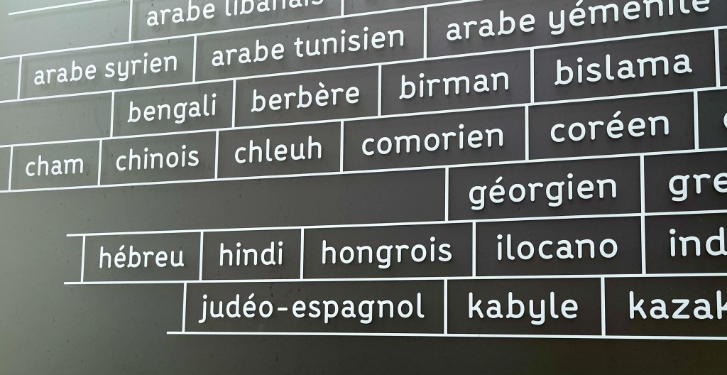 From the façade of the INALCO (Institut national des langues et civilisations orientales) in Paris. This is part of the list of languages offered at the institute. The one that caught my eye was judéo-espagnol or Judeo-Spanish, a variety I’ve long been fascinated by. (Photo taken by the author; September 6, 2024.)